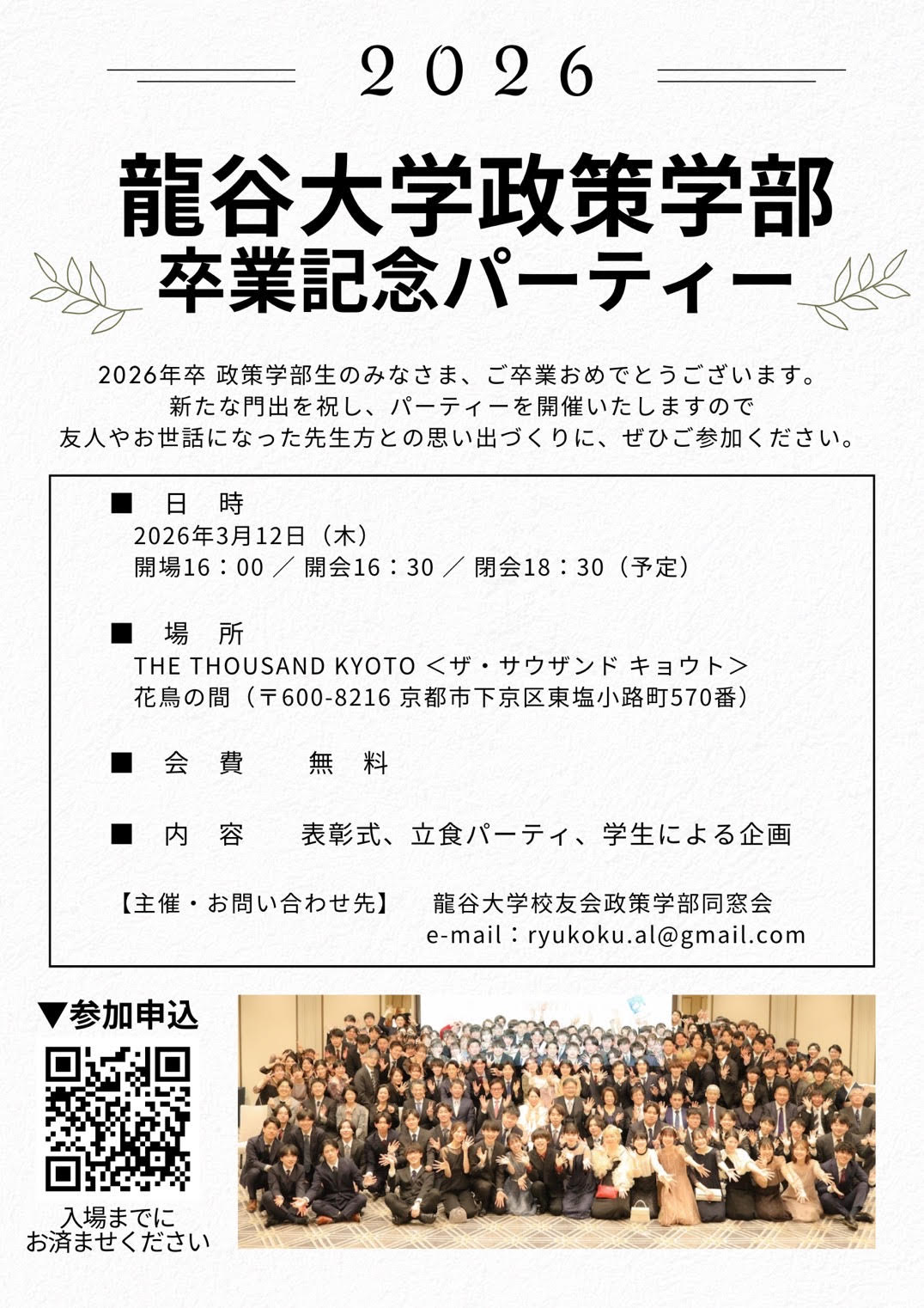 2026年卒業記念パーティー 卒業する4回生を対象とした卒業記念パーティーを実施します。4回生を中心とした実行委員を募る予定です。 イベント概要 開催日 2026年03月12日(木) 会場 調整中 この記事をシェアする シェアする ポストする 送る URLをコピー